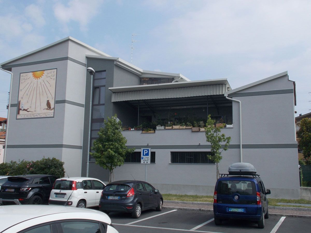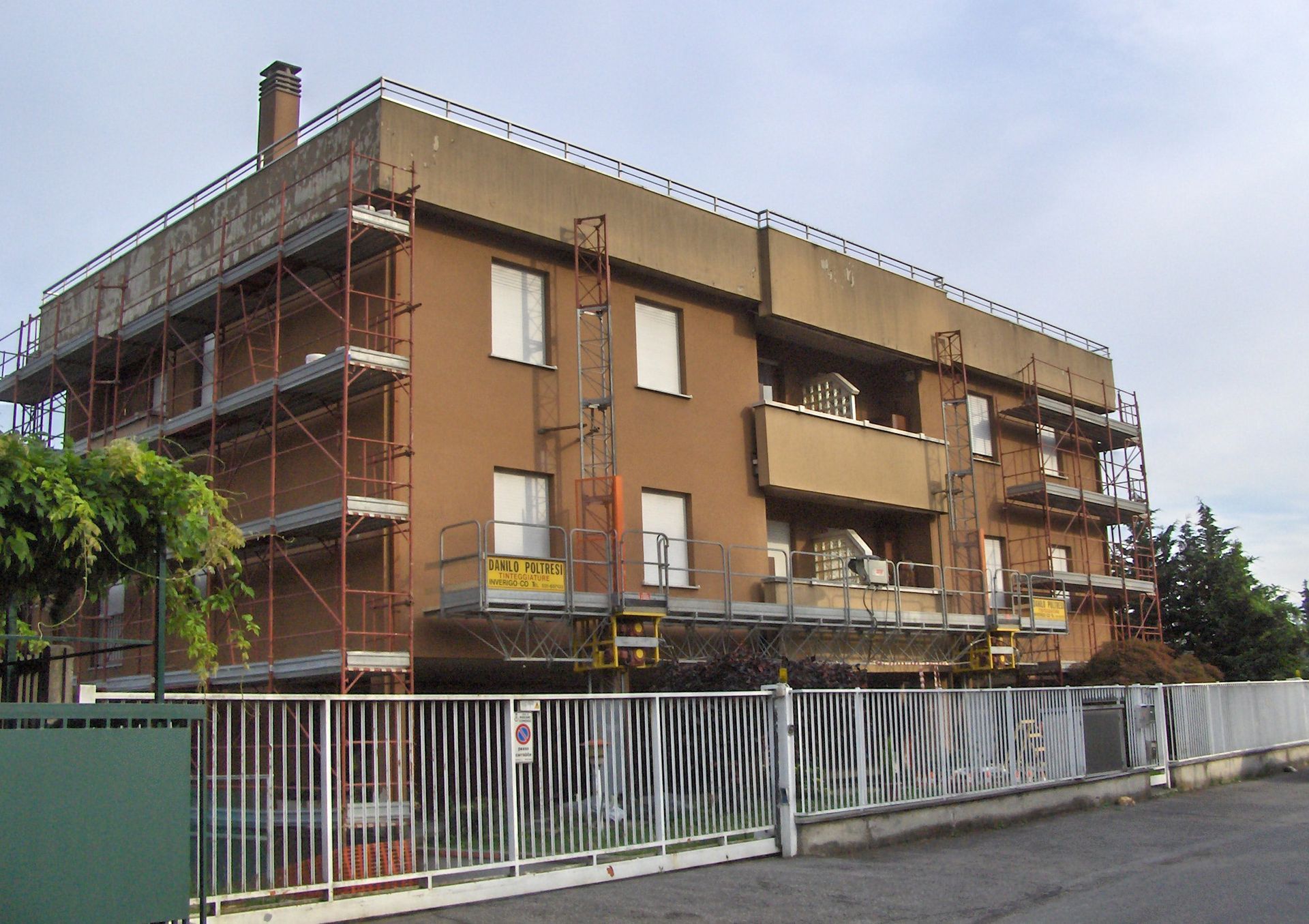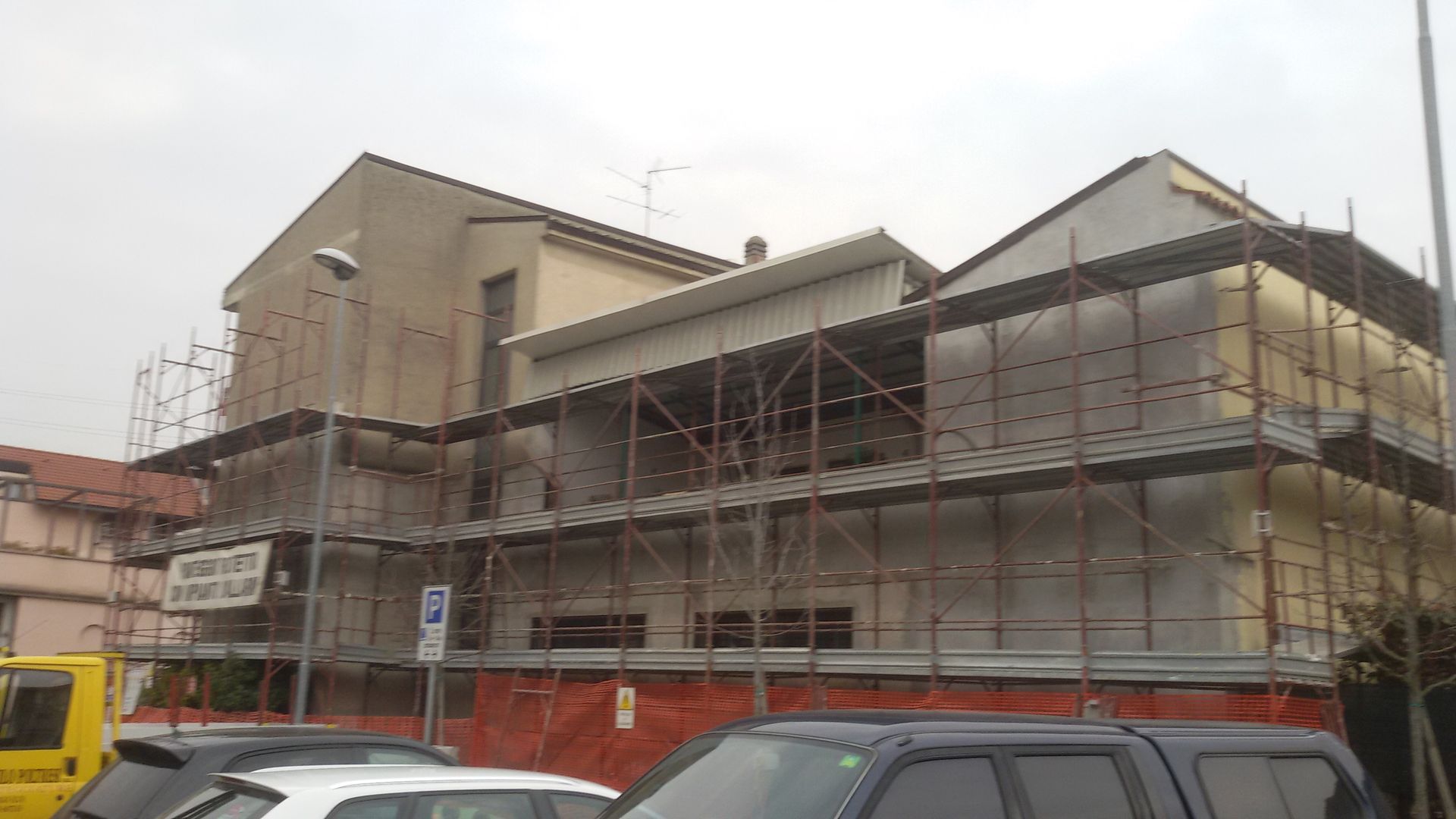 Rasatura armata, finitura con tonachino a spessore, realizzazione fasce marcapiano e realizzazione meridiana su facciata